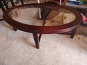 Glass top coffee tables 1 oval larger table and 2 round end tables. Measurements are oval table 50 L, 30W, 19 H round 24, 23 H. There are some marks on the wood.