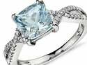 Aquamarine and diamond infinity twist ring in 14k white gold (7x7mm) size 6.5 aquamarine information shape cushion quantity 1 color blue dimensions 7.00x7.00mm setting type prong diamond information shape round quantity 34 total carat (average) 0.12 color I clarity si2 setting type pave